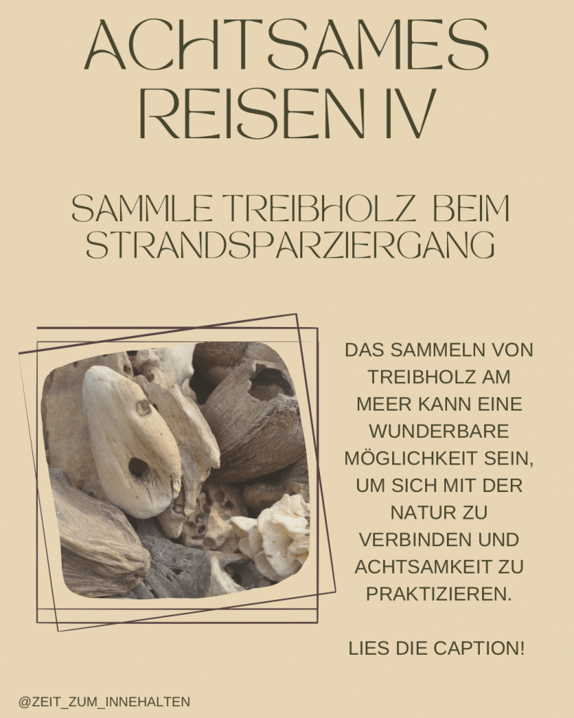 Das Sammeln von Treibholz am Meer kann eine wunderbare Möglichkeit sein, um sich mit der Natur zu verbinden und Achtsamkeit zu praktizieren. Hier sind einige Gedanken dazu: